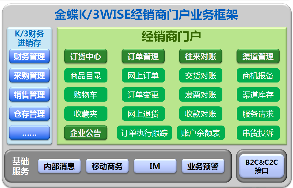 經(jīng)銷商管理系統(tǒng)主要以K/3WISE經(jīng)銷商門戶模塊為主,介紹經(jīng)銷商如何通過經(jīng)銷商門戶進(jìn)行溝通、訂貨、退貨、對(duì)賬等,形成金蝶K/3WISE經(jīng)銷商門戶解決方案。